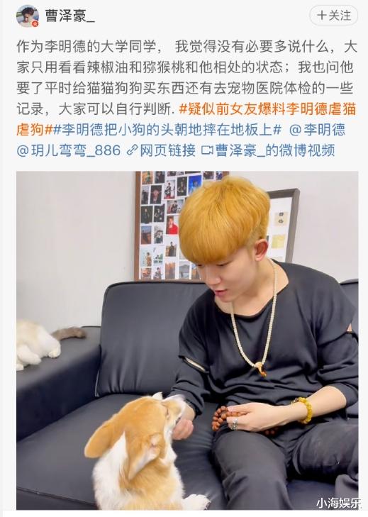而李明德女友发文后,李明德大学同学曹泽豪发声力挺李明德。称自己作为大学同学,撒不必多说什么,大家只需要看看李明德和自家宠物相处的状态,就可以自行判断了。随后,他发布了一段视频。