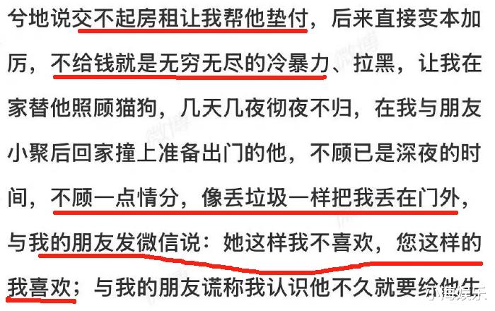 玥儿还爆料,李明德吃软饭、索钱无度,交不起房租可怜兮兮让自己帮垫付,后面就变本加厉要钱,不给钱就冷暴力。还曾不顾一点情分将自己丢在门外。还曾给自己的朋友发暧昧信息。