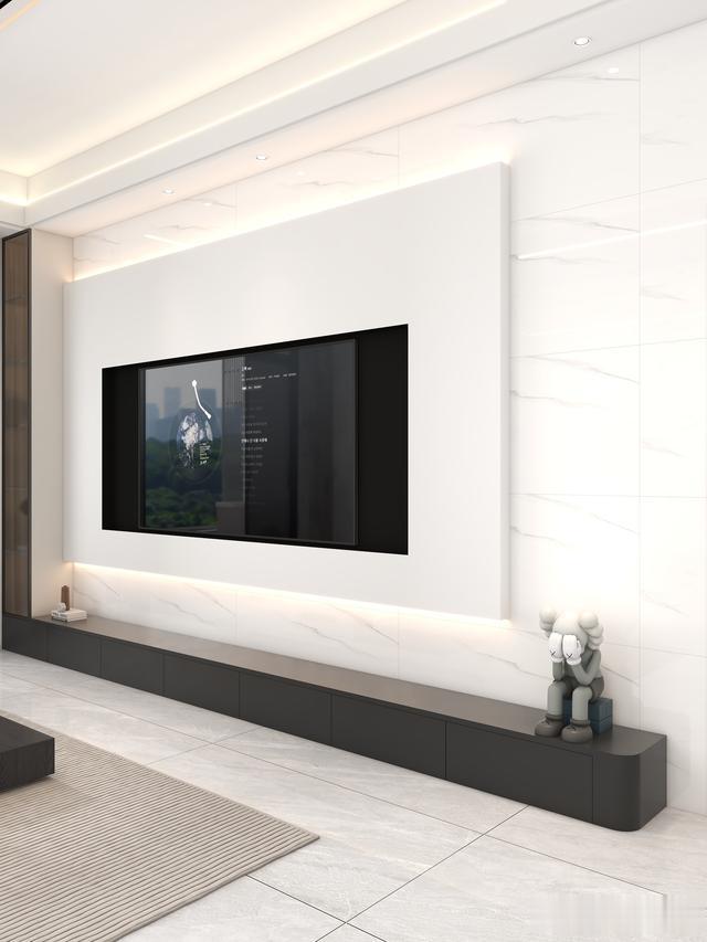 中间的部分留空,刷了黑色的乳胶漆,并没有做那种与电视机尺寸一致的造型,特意将两侧做宽,显得比例感更加协调一些。