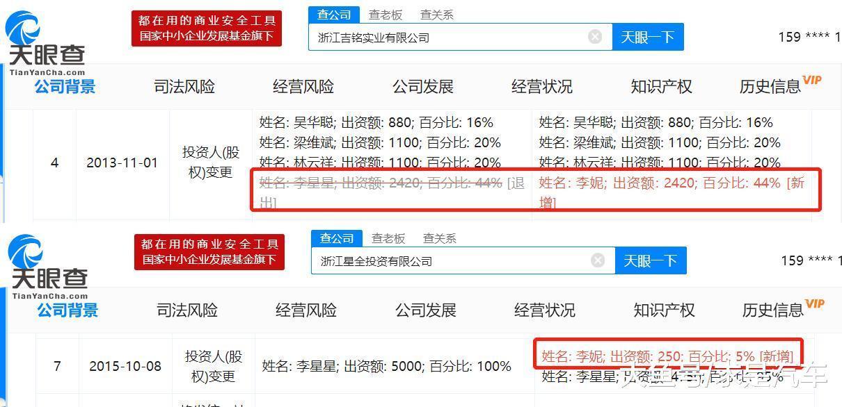 2013年初,主营摩托车业务的浙江吉铭实业有限公司进行股权变更,由吉利集团99.8%、陈官女0.2%的股权结构,变更为4个自然人持股。其中,李星星出资2420万元,持股 44%,是公司最大股东。同年11月初,公司股权再次发生变更,李星星的所有股权,由李妮接手。