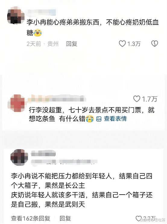“她说不能把压力给年轻人,结果自己四个大箱子,果然是长公主;庆奶说年轻人该多干活,结果自己一个箱子还是自己搬,果然是武则天”。