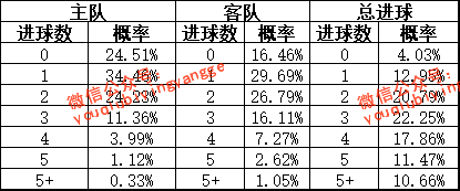 根据近20场技术统计,主队主场场均进球2.4个,场均失球0.9个;客队客场场均进球0.9个,场均失球2.4个。根据模型测算,本场主队进球数、客队进球数及总进球数的概率见下表: