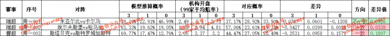最终,经过模型推算得出的胜平负概率以及根据机构开盘数据计算的胜平负概率见下表: