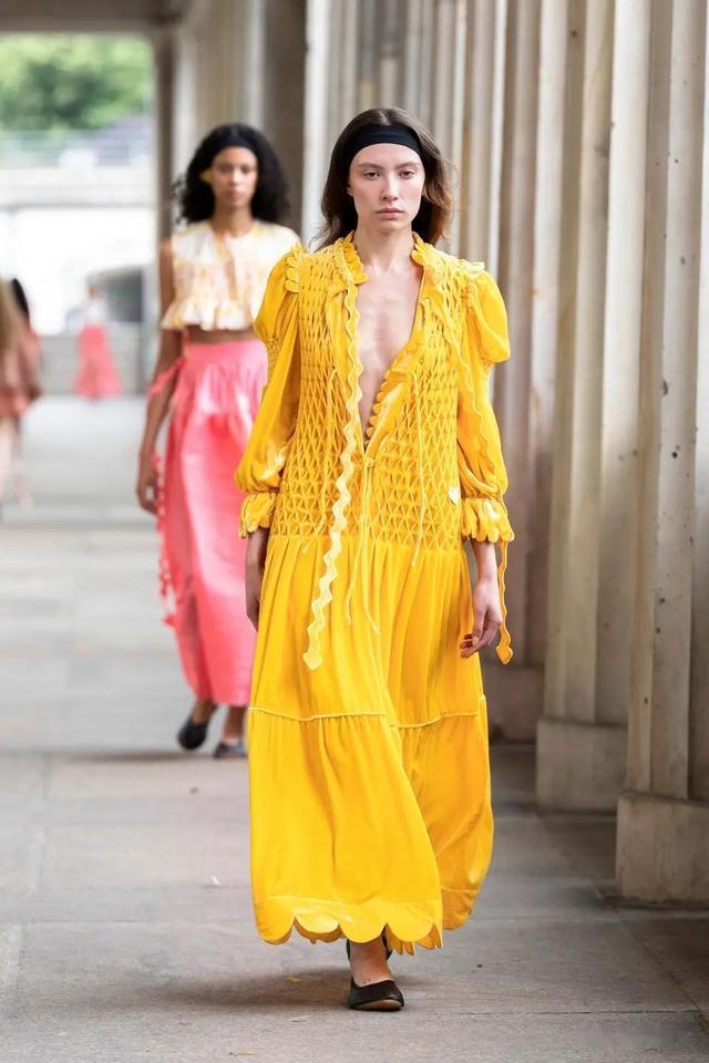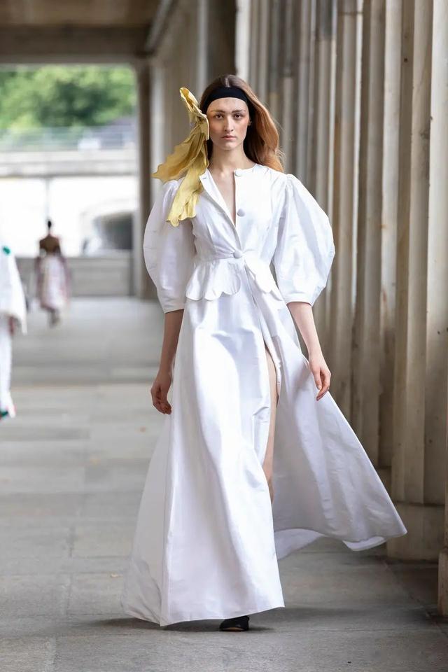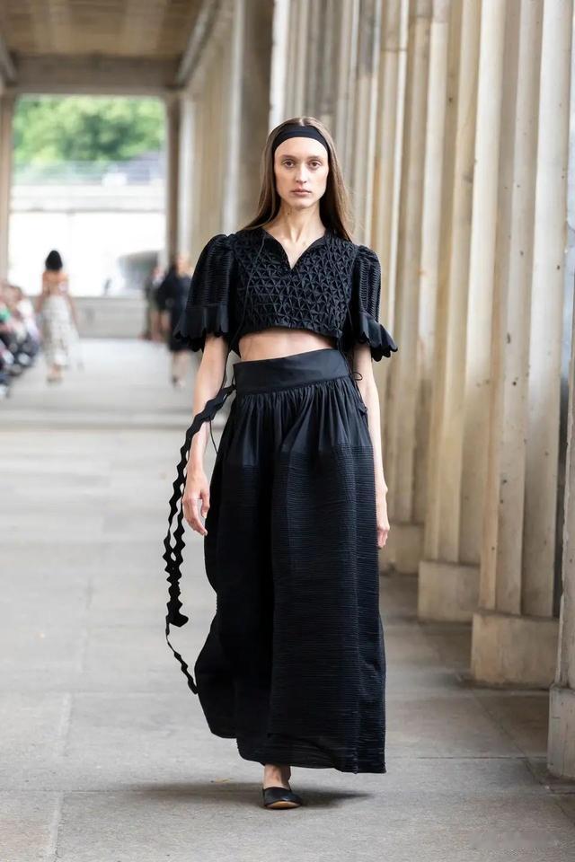 在人群中钦佩的窃窃私语中,聚光灯落在了海因里希斯精心制作的蜂窝形斗篷上,这证明了设计师血统中传承的永恒技术。Froschgoscherl 精致的褶皱与品牌标志性的波浪状图案相得益彰,每一针都与家族纽带和艺术传承的叙事产生共鸣。