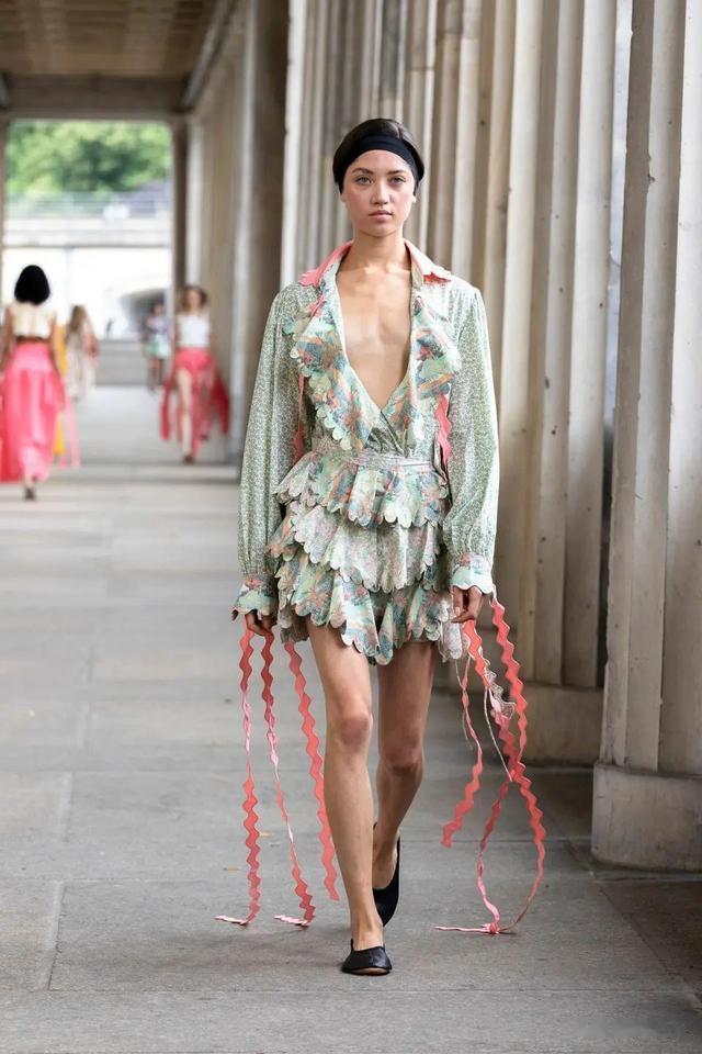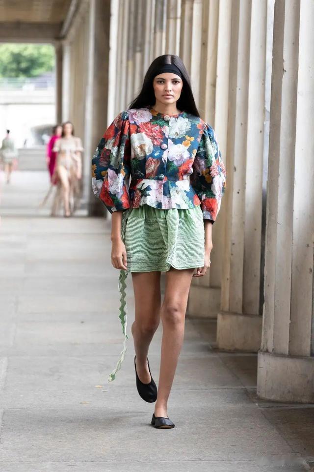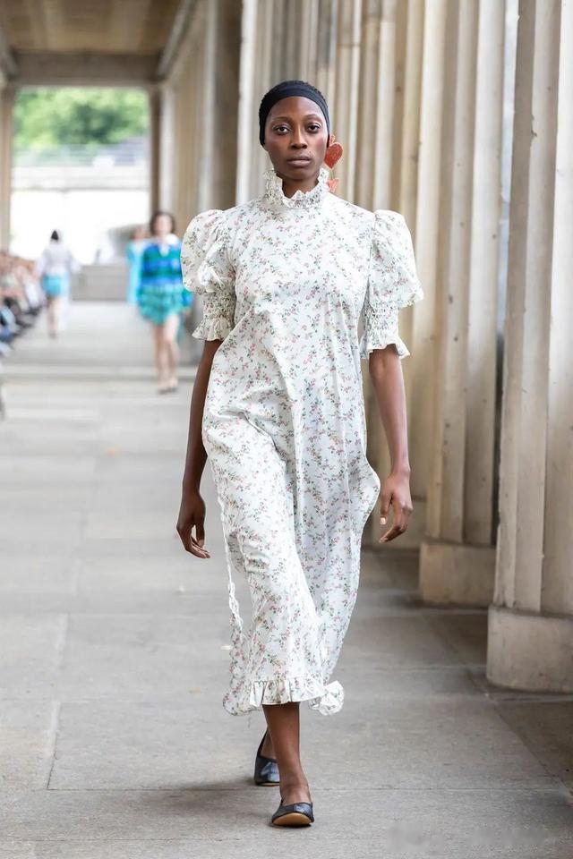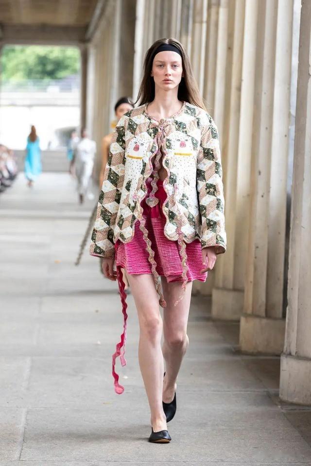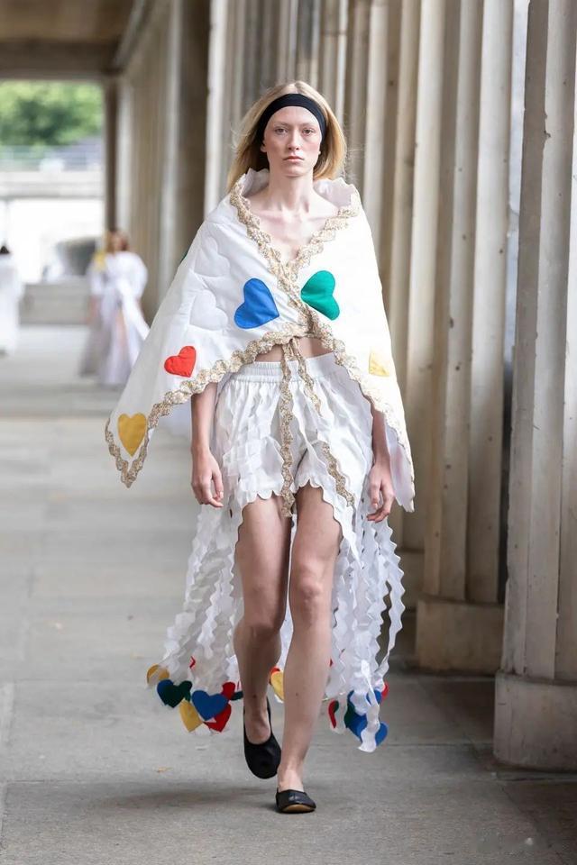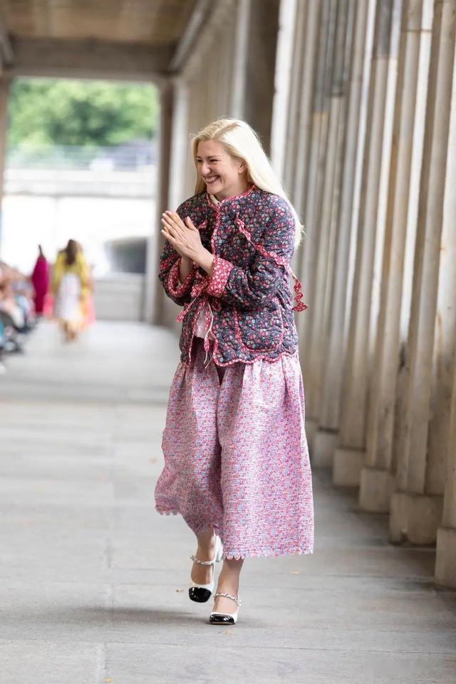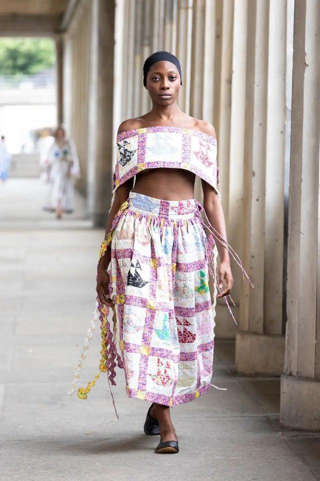 除了审美魅力之外,该秀的可持续发展精神还体现在材料的选择上。通过重新利用品牌历史上积累的剩余 Liberty of London 面料,设计师不仅尊重过去,而且拥抱了以环保实践为基础的未来。这件拼凑而成的杰作,是一百种面料无缝交织的交响乐,是对创造力和环保倡导的大胆声明。当最后一位模特鞠躬,观众爆发出热烈的掌声时,很明显,Horror Vacui 2025春夏已经超越了单纯的时尚;它已经成为一种关于爱、工艺和可持续性的叙事,错综复杂地交织在每件衣服中。
