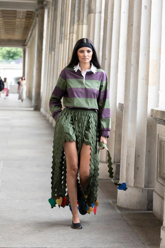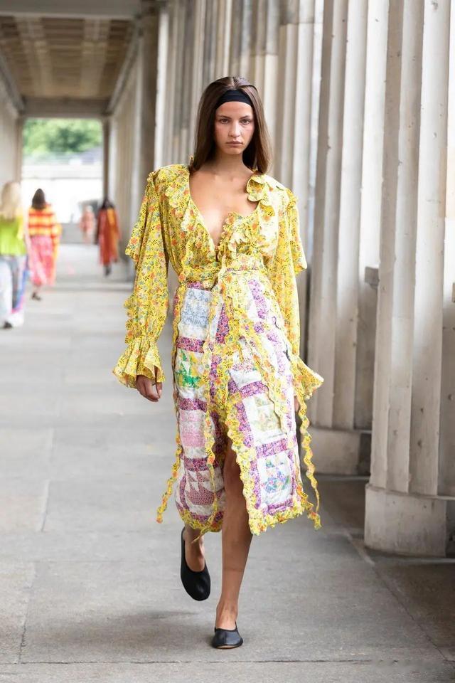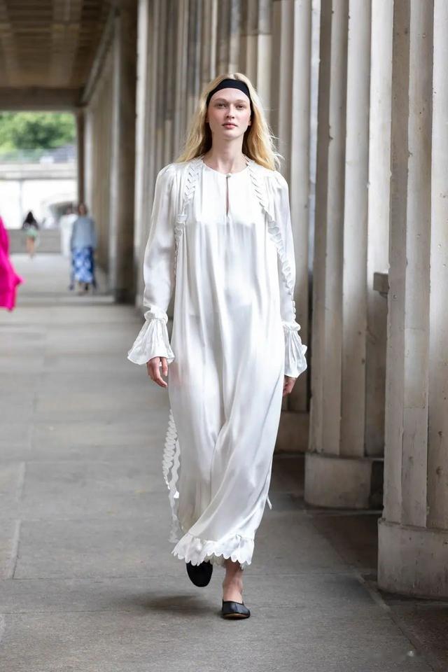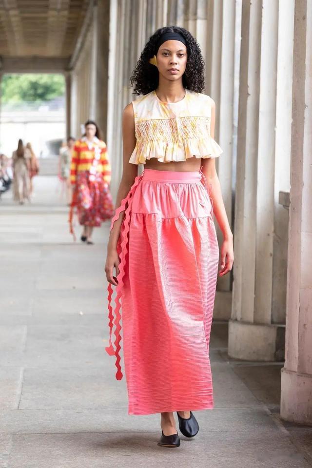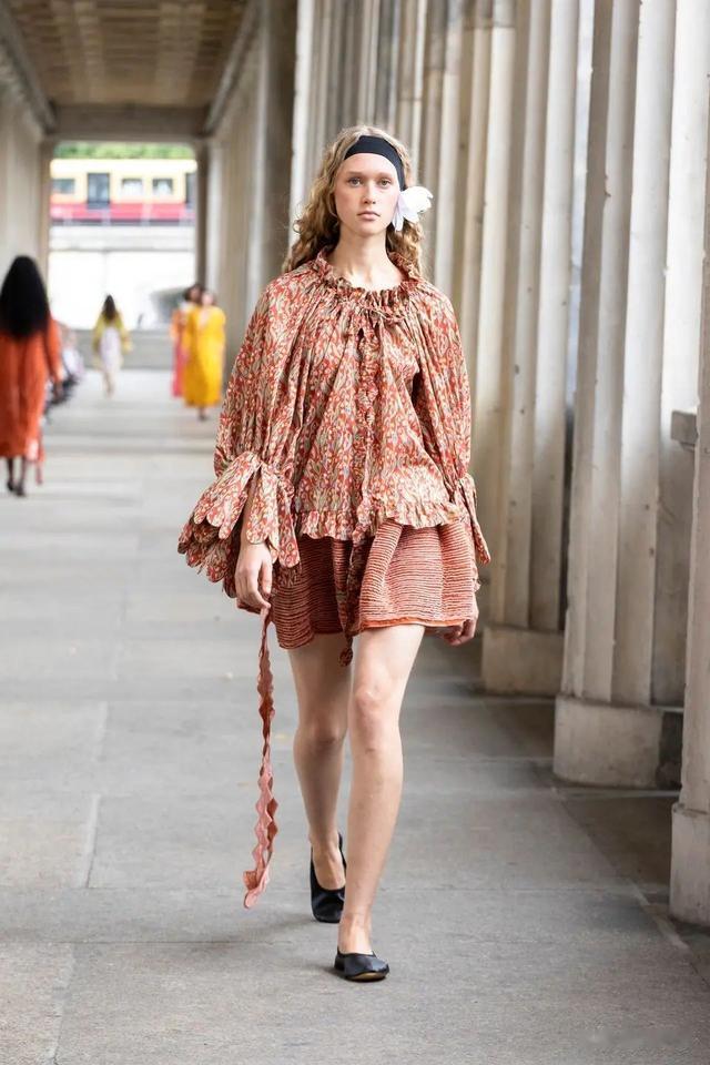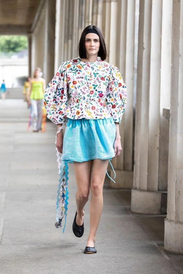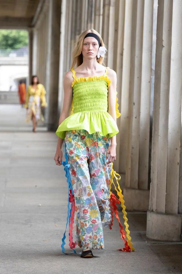除了审美魅力之外,该秀的可持续发展精神还体现在材料的选择上。通过重新利用品牌历史上积累的剩余 Liberty of London 面料,设计师不仅尊重过去,而且拥抱了以环保实践为基础的未来。这件拼凑而成的杰作,是一百种面料无缝交织的交响乐,是对创造力和环保倡导的大胆声明。当最后一位模特鞠躬,观众爆发出热烈的掌声时,很明显,Horror Vacui 2025春夏已经超越了单纯的时尚;它已经成为一种关于爱、工艺和可持续性的叙事,错综复杂地交织在每件衣服中。