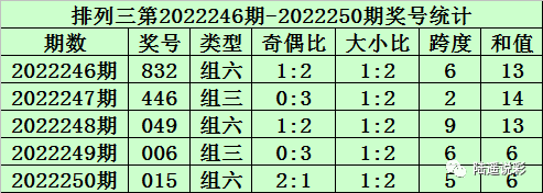 上期回顾:排列三第2022250期开奖号码为015。奖号类型为组六,奇偶比为2:1,大小比为1:2,跨度为5,和值为6。