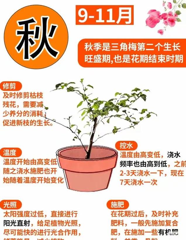 秋天,三角梅的热情并未消退。虽然阳光渐柔,但依旧是它的能量补给站,让它继续在枝头闪耀。浇水需适量减少,如同乐章中的舒缓段落,遵循见干见湿的原则,让土壤保持微微湿润,让三角梅在舒适中沉淀。施肥以磷钾肥为主,每月一次,为它的花朵增添持久的魅力,使它在秋意渐浓的时光里,依然续写着华美的篇章,与落叶共舞,与秋风和鸣。