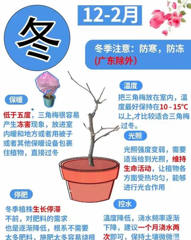 寒冬降临,三角梅进入了静谧的休眠期。将它移至室内温暖且阳光充足之处,那是为它搭建的温暖港湾。减少浇水频率,让土壤保持微干,就像为沉睡的精灵盖上一层轻柔的薄被。停止施肥,让它在宁静中休养生息,积蓄力量,等待来年春天再次苏醒,重新奏响生命的旋律。