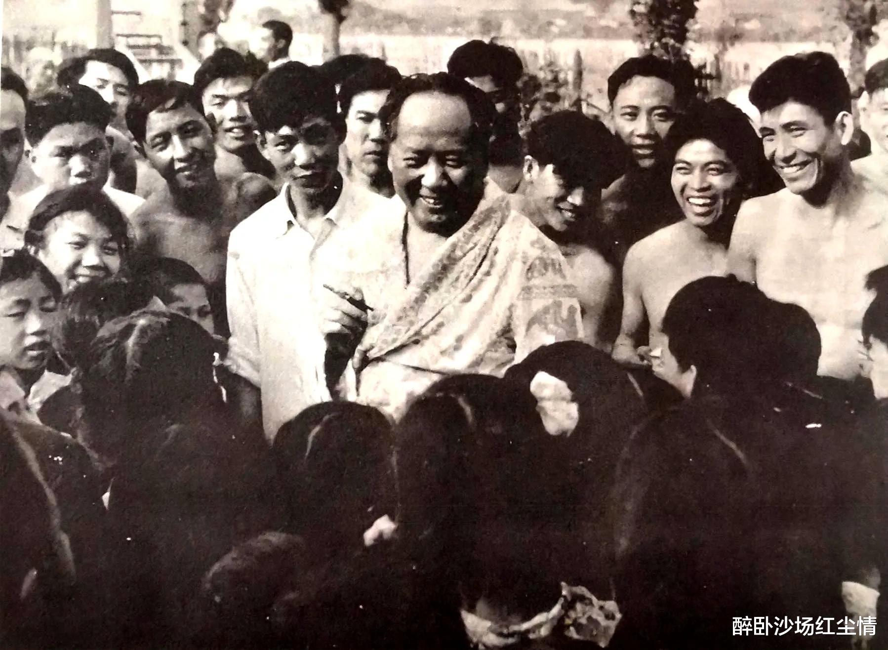 1959年6月24日,毛主席在湘江游泳后登上长沙牛头洲,主席身后右二为钱水桃