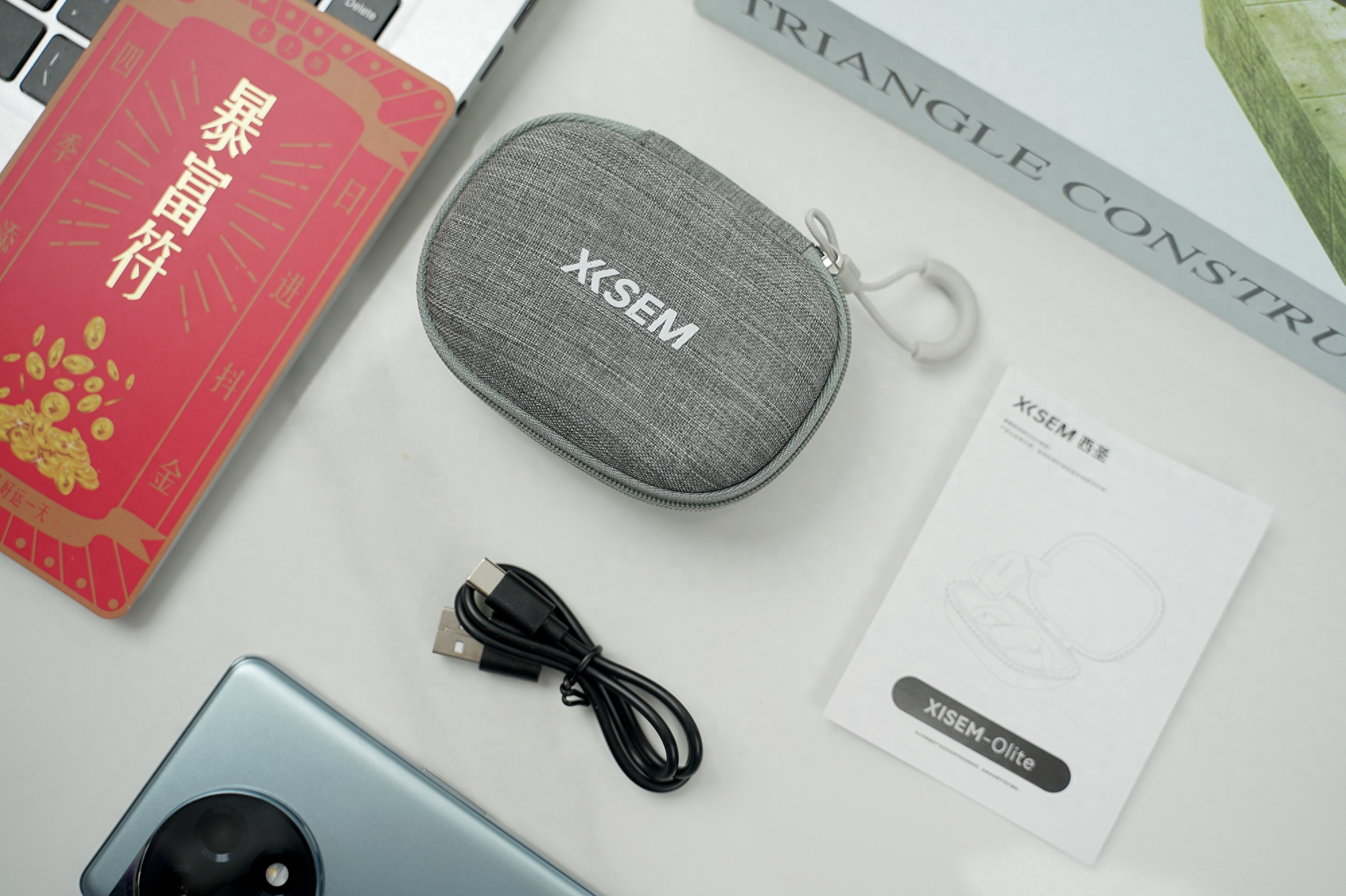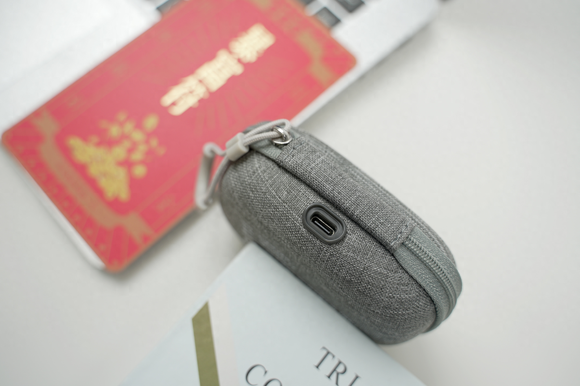 与传统的充电盒有所不同,西圣Olite采用了充电盒与收纳袋融为一体式的设计,表面采用了灰色编织材质覆盖,不仅耐磨、耐摔,而且看上去更上一个收纳包。而且拉链式的收纳包,设置了Tpye-C充电接口,内置390mAh锂电池,满电情况下可以给耳机带来长达54小时的续航体验。