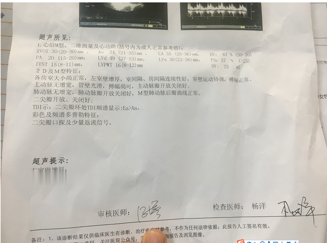 心脏彩超检查,提示:左室壁增厚、二尖瓣轻度返流;