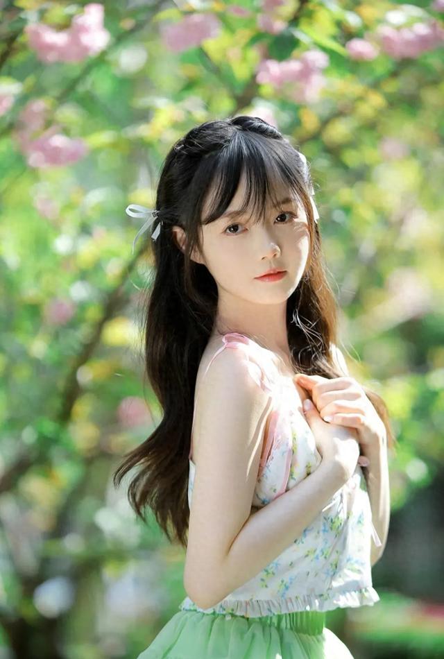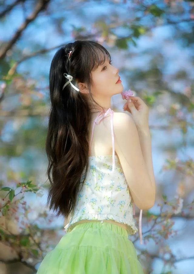 森系风格好看,搭配自然绿色裙和碎花吊带,邻家女孩的气息扑面而来。[赞]