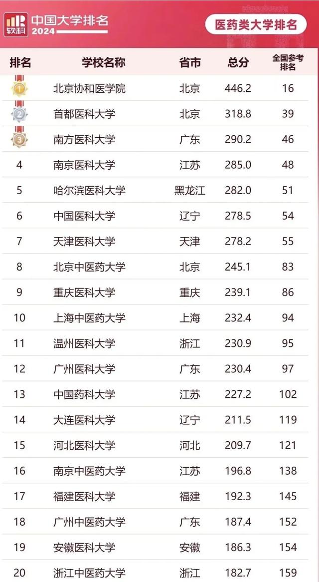 哈尔滨医科大学在医药类大学中,排名非常靠前。在2024软科医药类大学排名中,仅次于北京协和医学院、首都医科大学、南方医科大学和南京医科大学,位居第五位。