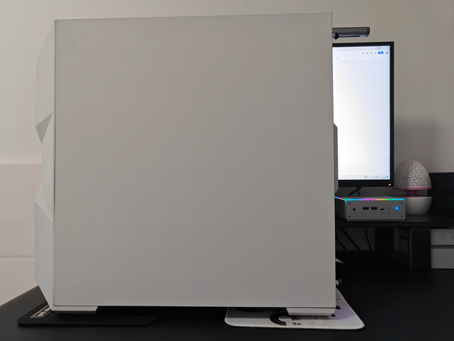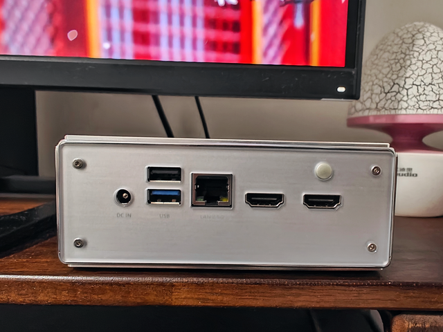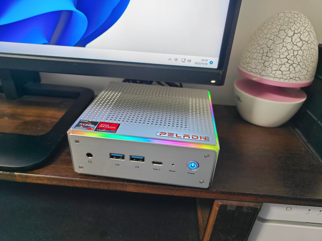 背面则是DC 19V电源接口,1个USB 3.2接口、1个USB2.0接口,网线接口,2个HDMI接口和灯效控制开关,从接口上配置上看很良心了,而且迷你主机更小巧的背面接口要比普通主机用起来方便很多,大大增加了实用性。