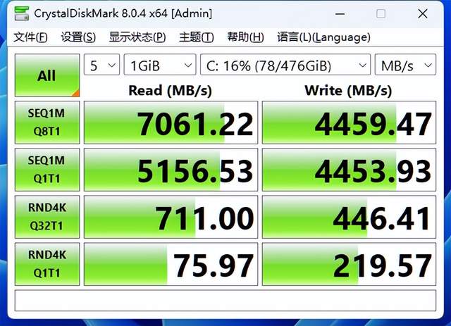 在存储速度测试中,磐镭HA-4在CrystalDiskMark中达到了7061MB/s的读取和4459MB/s写入速度。4K随机读取速度为75MB/s,写入速度为219MB/s,在日常大数据传输上不属于慢的了。