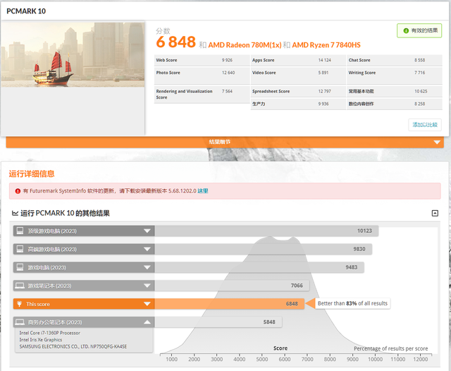 PCMARK10作为办公最常用的测试软件,磐镭HA-4拿到了6848分,可以轻松应对办公处理、播放4K高清电影,进行Photoshop及视频处理等日常工作,在对比上来看,性能上要比英特尔酷睿 i7-1360P商务办公本更加出色。