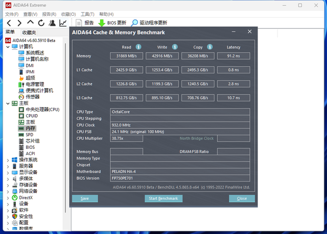 在AIDA64对内存测试中,写入速度为42916 MB/s,读取速度为31869MB/s,很出色的读写速度。