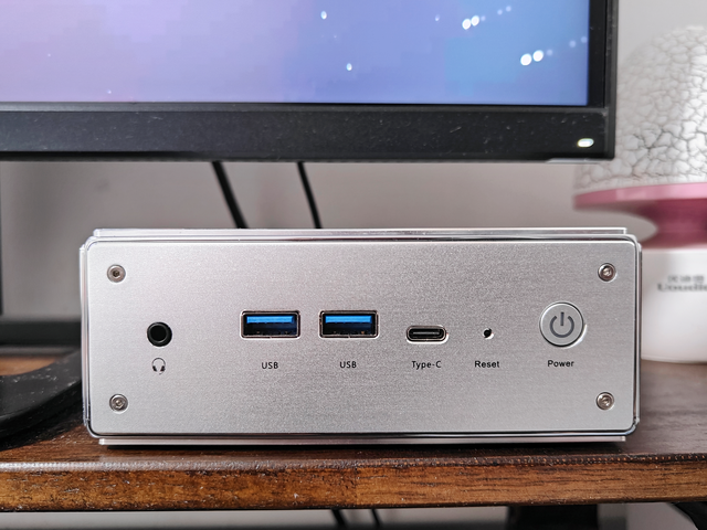 磐镭HA-4银翼迷你主机的正面是电源键,复位键,1个type-C接口,2个USB 3.2接口以及3.5mm音频接口,和普通主机的设置上几乎一致,而且配备了一个type-C接口确实很是非常实用的了。