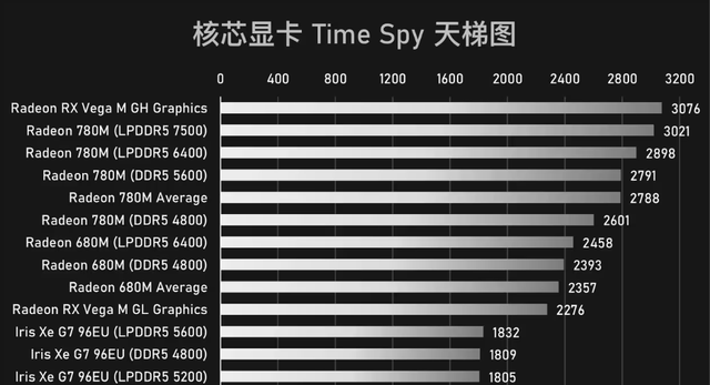 R7 7840HS处理器搭配了Radeon 780M 核显,Radeon 780M由AMD最先进的RDNA3架构打造,拥有 12CU,GPU 频率为 2700MHz。Radeon 780M 核显的性能大概在英伟达 GTX 1650 Ti Max-Q 和 GTX 1650 Max-Q 之间。3DMark TimeSpy天梯图分数3000+,已经能满足很多游戏日常娱乐使用。