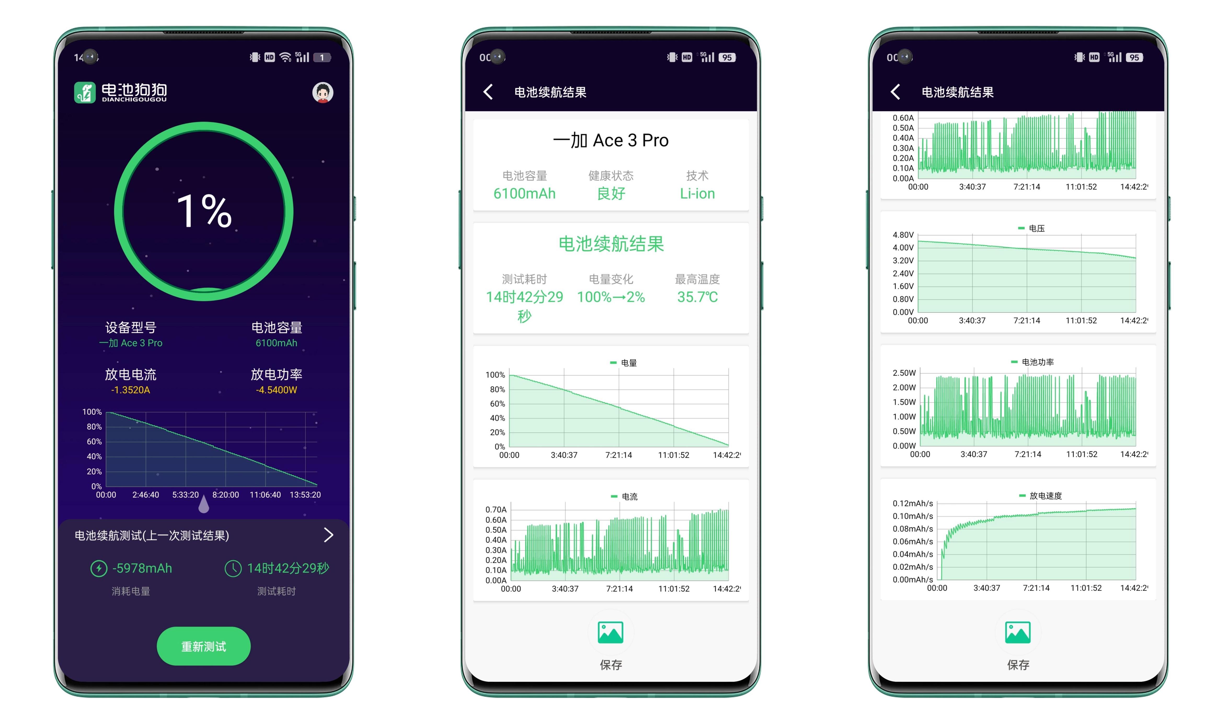 ▲使用电池狗狗监测一加Ace 3 Pro的续航表现,发现手机电量从100%到2%,能坚持14小时42分29秒,这个长续航表现我觉得特别好,即便是较长时间的户外旅行,学生朋友们也可以不用担心手机没电了。此外,虽然一加Ace 3 Pro搭载的6100mAh大电池,但它的机身重量却控制得很好,不会像一些主打长续航的游戏手机那般笨重。