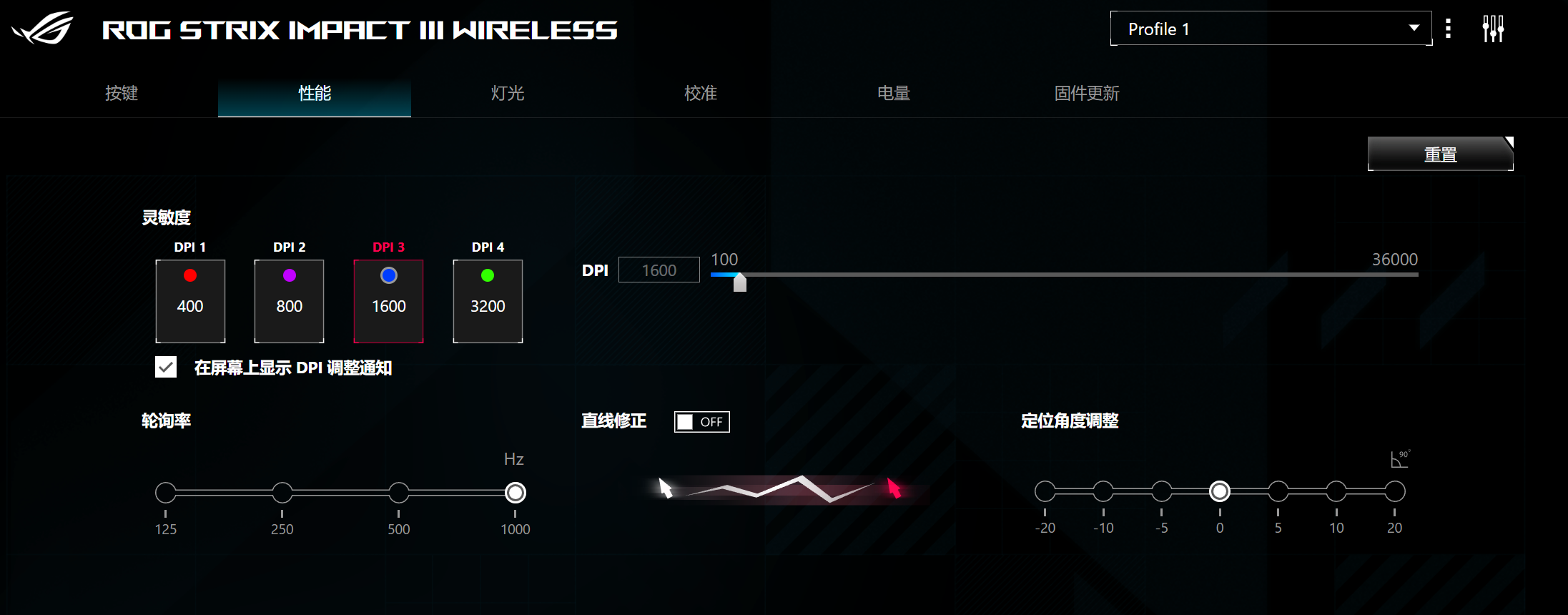▲ROG影刃3无线版拥有400、800、1600和3200四种固定灵敏度,当然,你也可以在100-36000范围内自由调节;轮询率包含125、250、500和1000Hz四种。此外,用户还可以根据个人使用习惯和感受,选用直线修正功能,或是进行定位角度的调整。