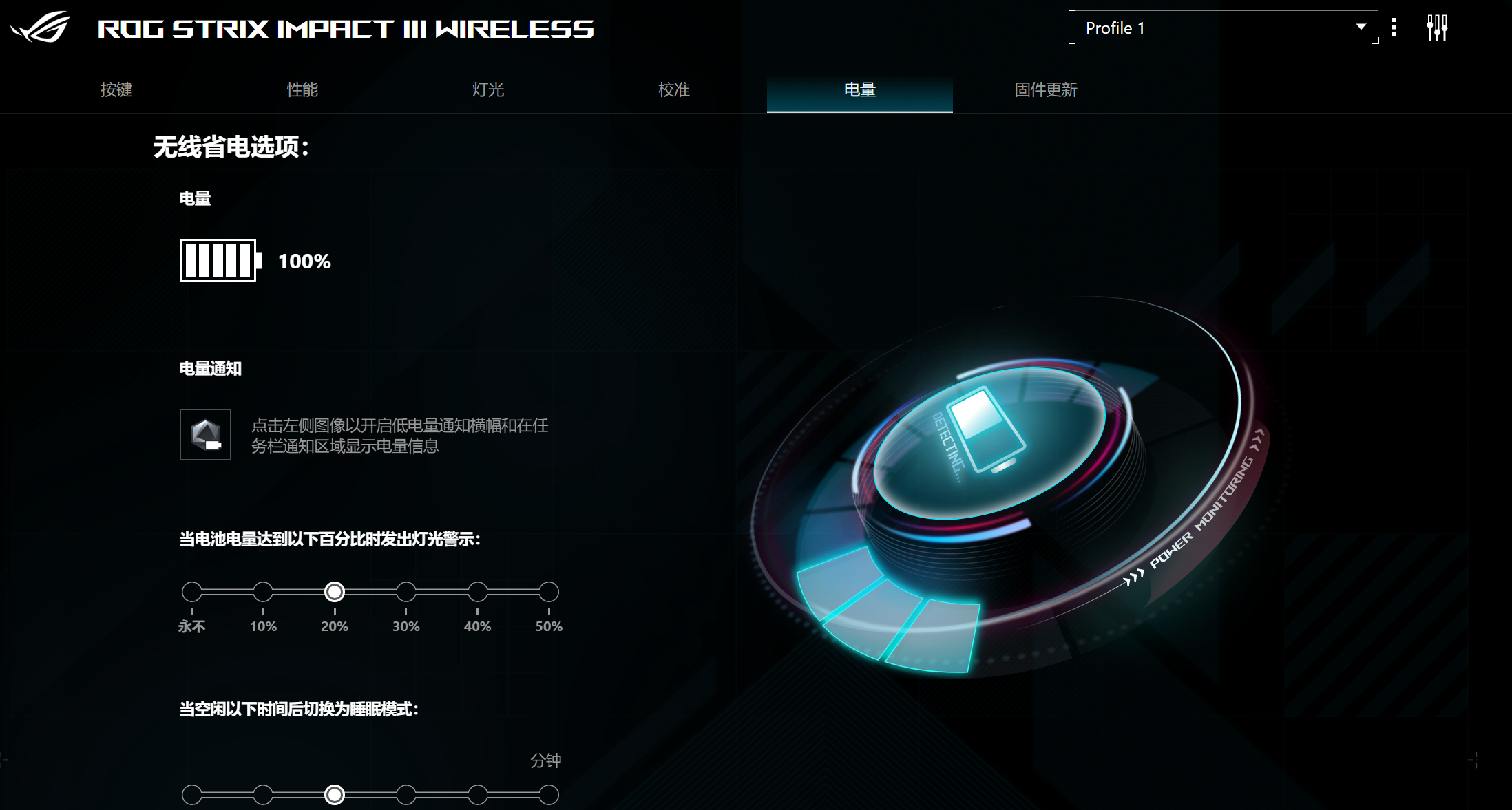▲前文中也提到了,ROG影刃3无线版的蓝牙/无线两种模式续航时长分别可达618和450小时,所以一般是没什么电量焦虑的。不过不定期在Armoury Crate奥创软件离看看鼠标的剩余电量,设置电量警示,则有助于用户及时判断鼠标当前电量(特别是,ROG影刃3无线版使用的电池,相比充电式鼠标,更需要及时关注电量剩余),并且通过设置进入睡眠模式的时间,来节省电量。