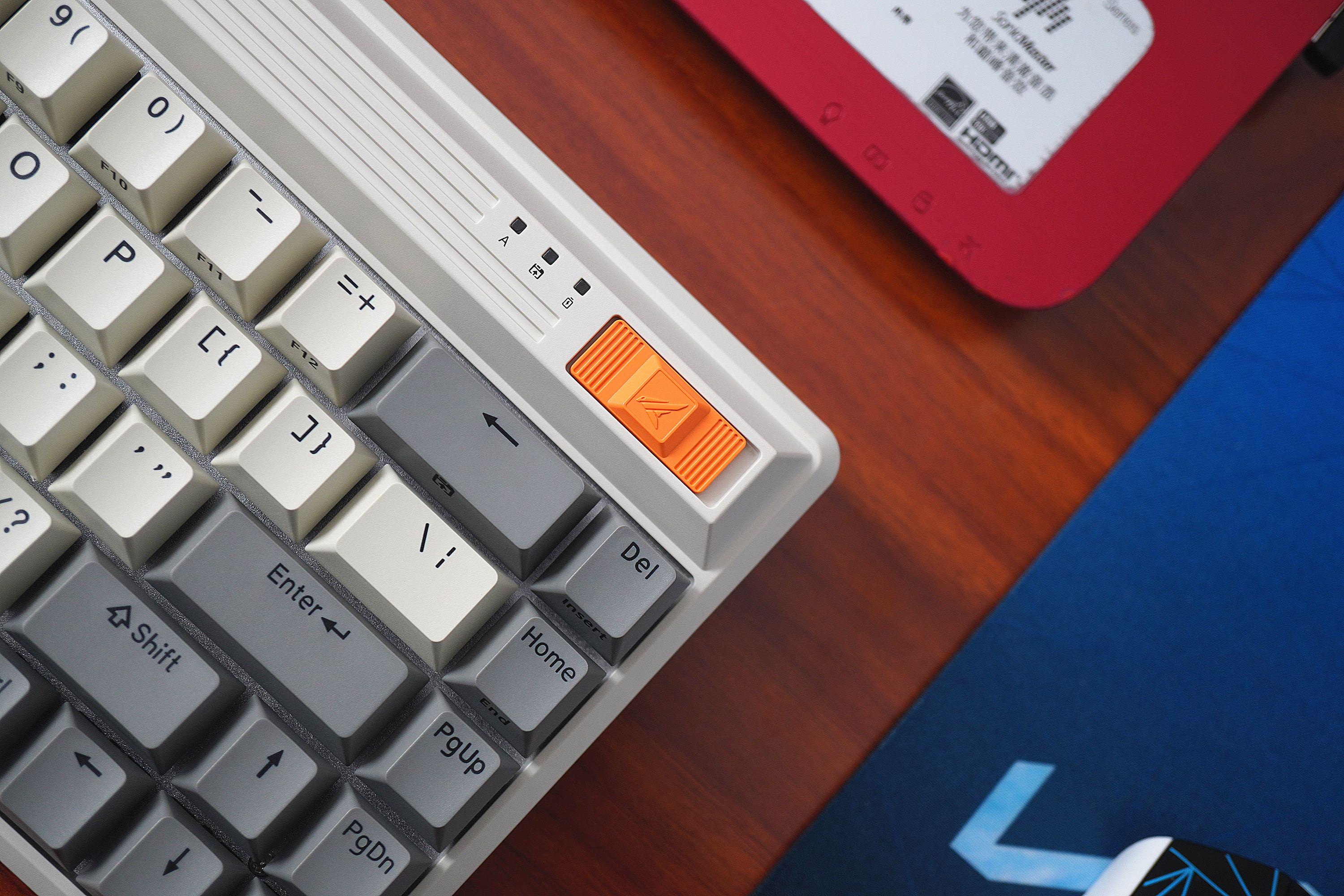 ▲三盏指示灯分别为大小写指示灯、配置文件指示灯和电量指示灯,并且对应蓝牙1、蓝牙2和2.4G无线模式的慢闪显示。推拉式电脑开关可谓满满的年代感。