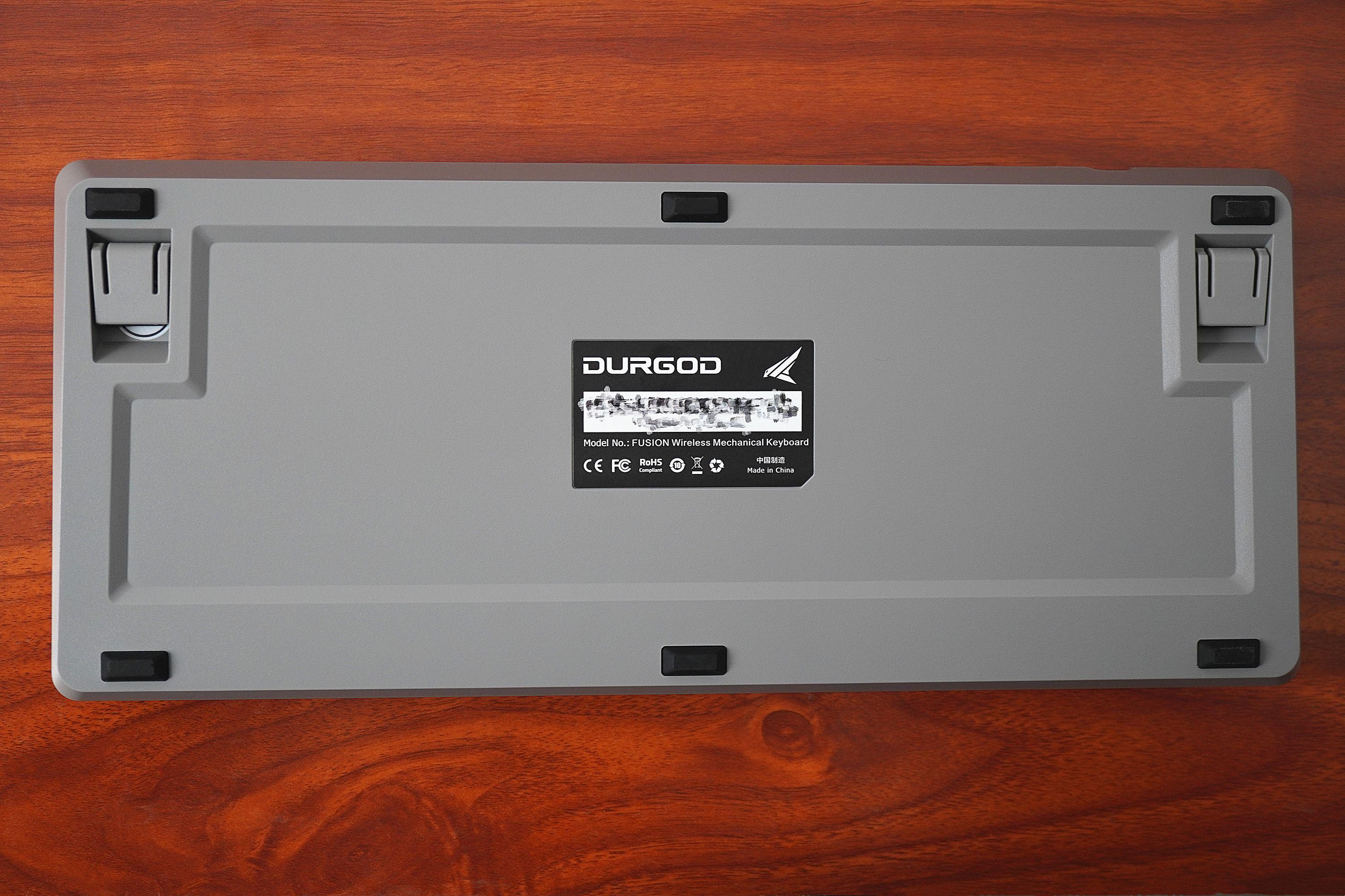 ▲杜伽Fusion采用PBT键帽,手感挺不错,而且这种材质的键帽也不容易打油。双色成型工艺下的键盘字符不容易磨光,这在我之前的杜伽键盘使用过程中已经验证过了。Fusion顶栏颇具复古风,区别于现在的无边框设计。顶栏上包含杜伽的品名、无线开关键和三盏指示灯。