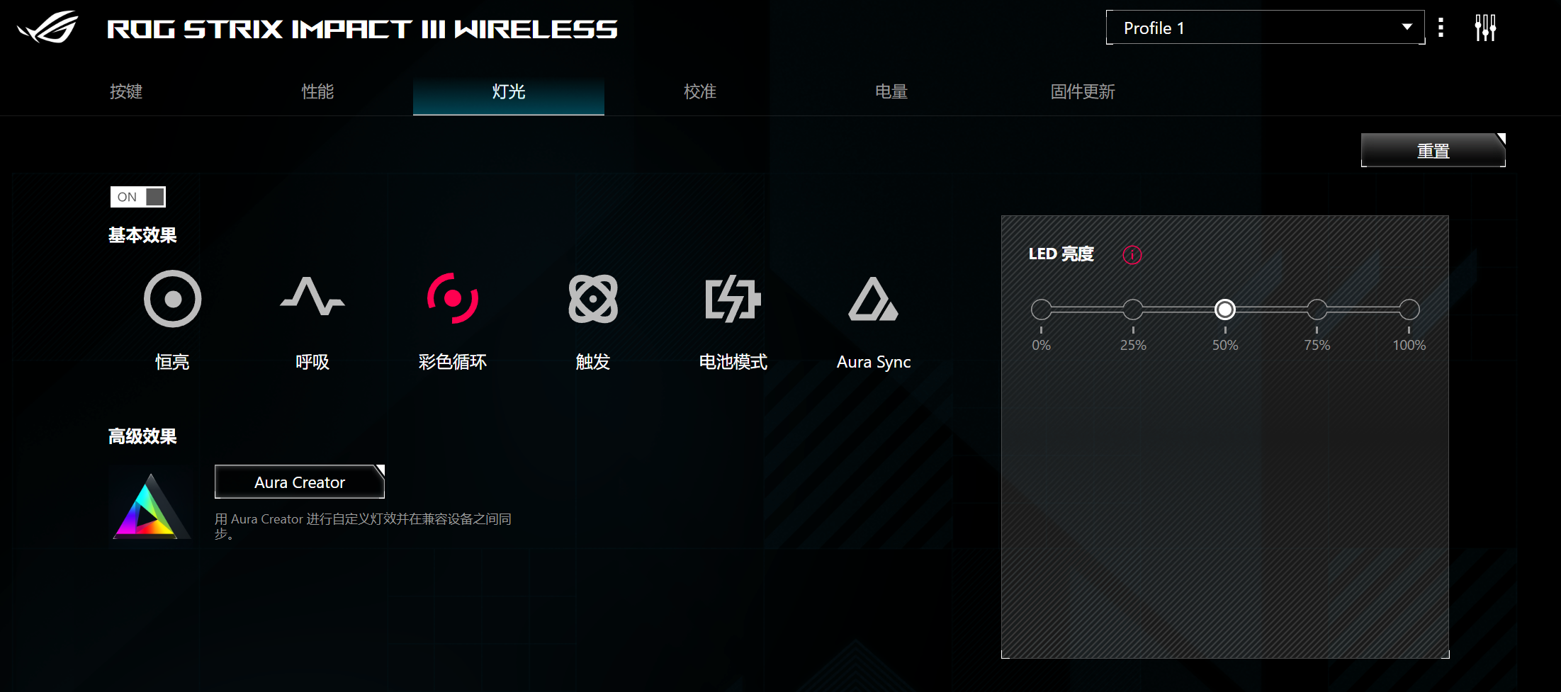 ▲ROG影刃3无线版支持AuraSYnc神光同步,RGB灯效则可以在配套的Armoury Crate奥创软件中调节。可选的基本效果包括恒亮、呼吸、彩色循环、触发、电池模式和Aura Sync等,当然,如果这些灯效中仍然没有你喜欢的,你也可以在Aura Creator中进行高级效果定制。LED亮度也是可调的,氛围0、25%、50%、75%和100%五个档位。