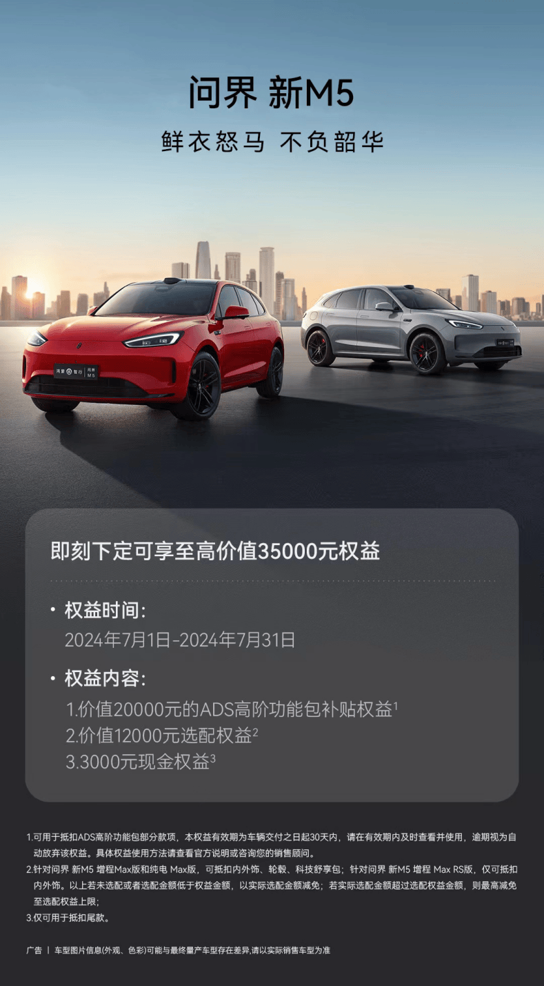 下半年伊始,起售价24.98万元的问界新M5继续以满满诚意和超值福利回馈广大消费者。7月下定可继续享受至高3.5万元的购车权益,涵盖赠送价值20000元的城区智驾包等额抵扣券、赠送价值12000元选配金以及3000元现金优惠,此外,还最新提供了0首付,1.99%低息金融方案,感兴趣的朋友不要错过!