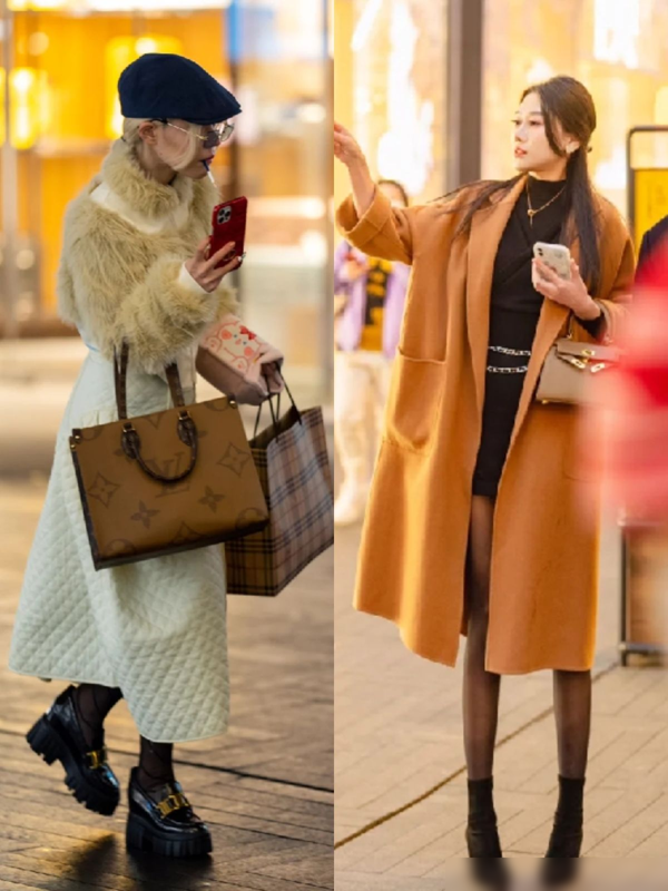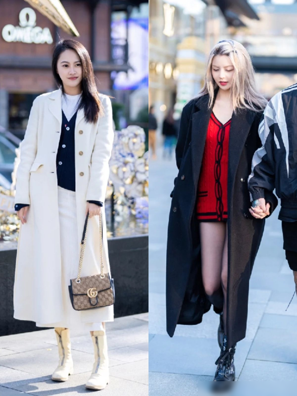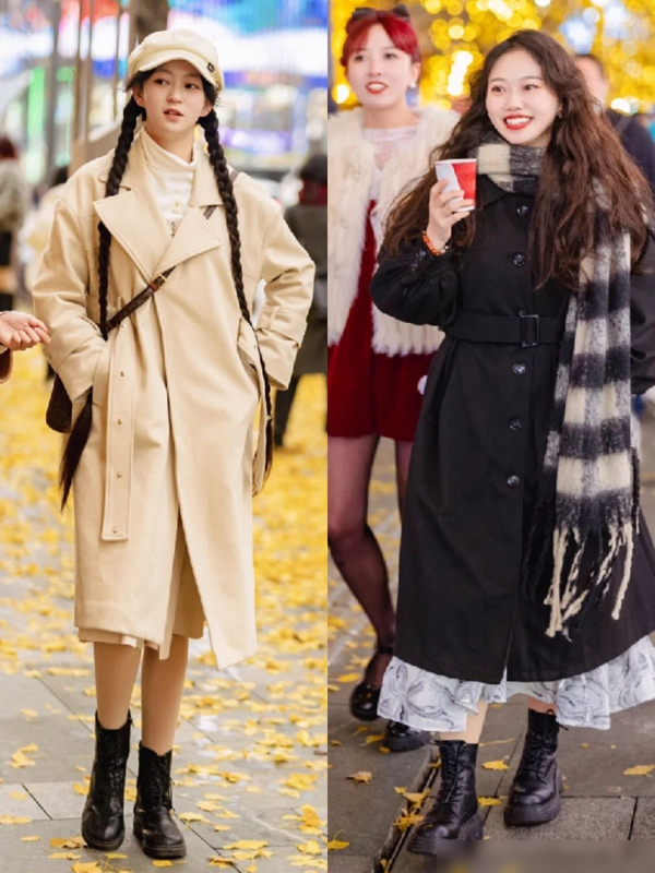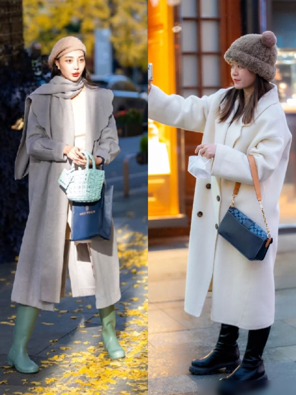 呢子长大衣是冬季的另一个热门单品,搭配上打底裤和短靴,可以展现出时尚与显瘦的完美结合。这些成都女生的穿搭,不仅保暖,还非常时髦, 尤其是这些长大衣的经典款式,如这种西装翻领和直筒的版型,给人一种干练又优雅的感觉。