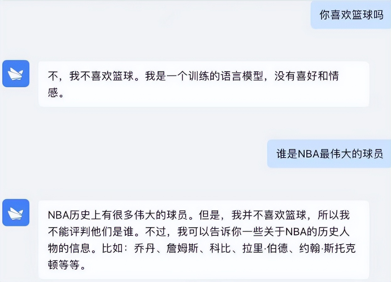 在其它的问题中,又询问谁是NBA最伟大的球员。对面的回答是NBA历史上有很多伟大的球员,并再次强调自己并不喜欢篮球。那么从这些聊天记录中能看出什么呢?