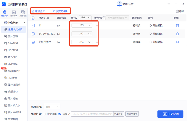 打开后找到并点击首页的【通用格式转换】,支持批量操作,可根据自身需求来选择添加图片或文件夹,系统会默认将上传的所有图片转换为JPG格式。