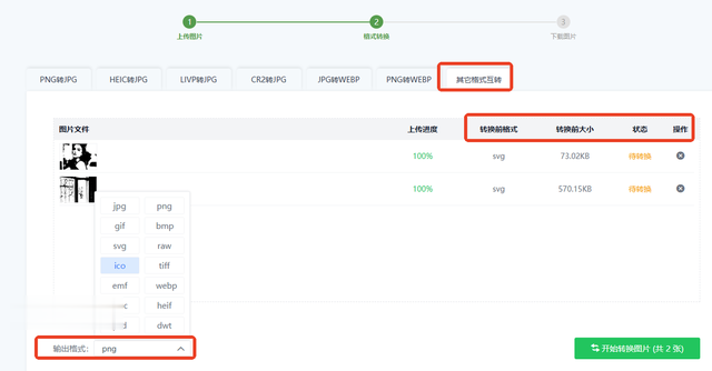 先在“特色功能”模块选中【格式转换】,再添加目标图片,单或多张都支持,然后将转换格式设置为所需的PNG,按下“开始转换”后等待完成就能得到了。