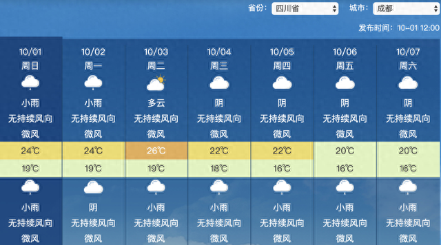据成都气象,成都于9月22日正式入秋,比常年偏晚10天。冷空气预计国庆后期抵蓉,日最低气温降至14℃。