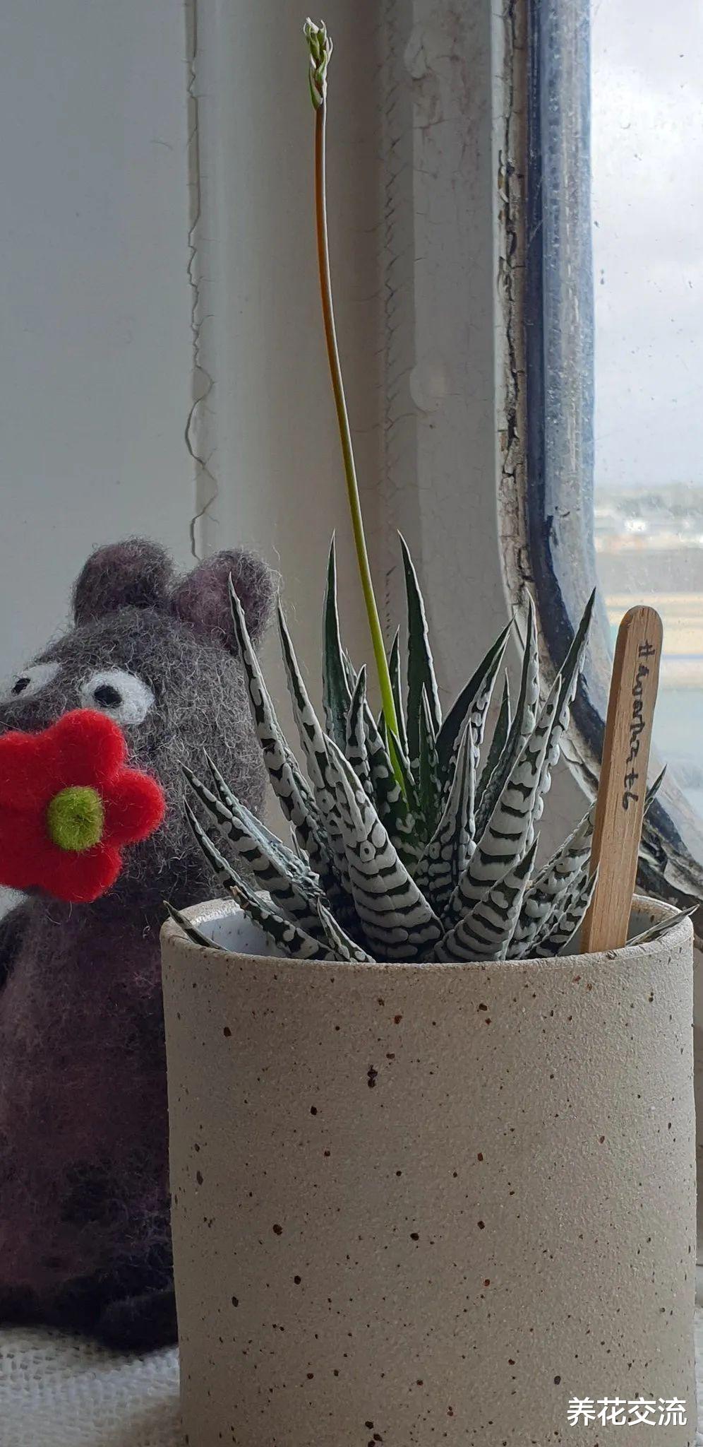 若是给它提供较多阳光,控制浇水,它偶尔还能开出白绿色的小花,有一根特别长的花茎从植株中心处抽出来。