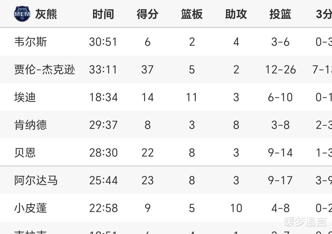雄鹿方面,尽管字母哥依然展现了MVP级别的实力,拿下30分11篮板7助攻2抢断的全面数据,朱·霍勒迪也贡献了15分3篮板9助攻,试图带领球队反击。但面对灰熊全队上下齐心协力的出色表现,雄鹿最终还是未能抵挡住灰熊的攻势。 尽管比赛过程中比分交替领先,双方球员都展现了高超的竞技水平,但灰熊在末节的强势爆发最终决定了比赛的走向。 这场比赛的胜利,无疑凸显了灰熊队强大的阵容深度和团队合作精神,也展示了他们在缺少核心球员的情况下依然具备争冠实力。 Jarrett Allen等其他雄鹿球员的表现虽然未被详细提及,但他们的努力也值得肯定,他们与灰熊球员在赛场上展开了一场精彩的对抗。