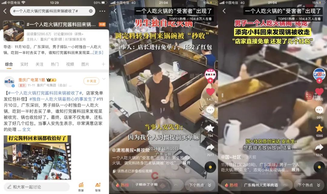 随着舆论的持续发酵,该事件一路冲上了抖音、微博、百度等多平台热搜榜。其中,#一个人吃火锅打完酱料回来锅被收了#的微博话题, 获得近5300万的阅读量,吸引近万名网友加入大讨论。