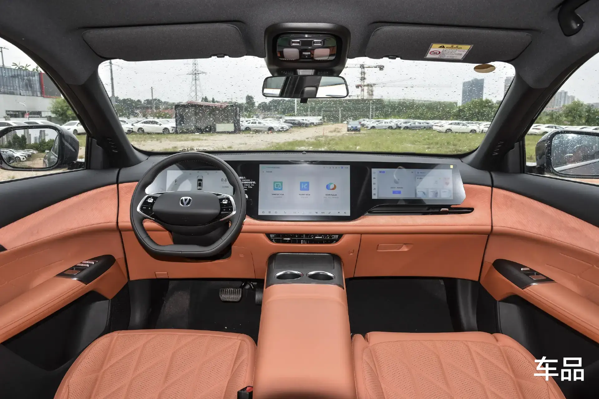 内饰方面,CS75 PLUS现在不仅采用了环绕式中控台与门板结构,实现了多层次的融合,还更换上了双辐式方向盘、水平布局的10.25+14.6+12.3英寸三联屏,还有将主副驾驶舱一分为二的贯穿式扶手箱等等。整个座舱在装饰中也应用了大量皮革材料,并在部分区间采用了弧面结构与多重织物纹理装饰。