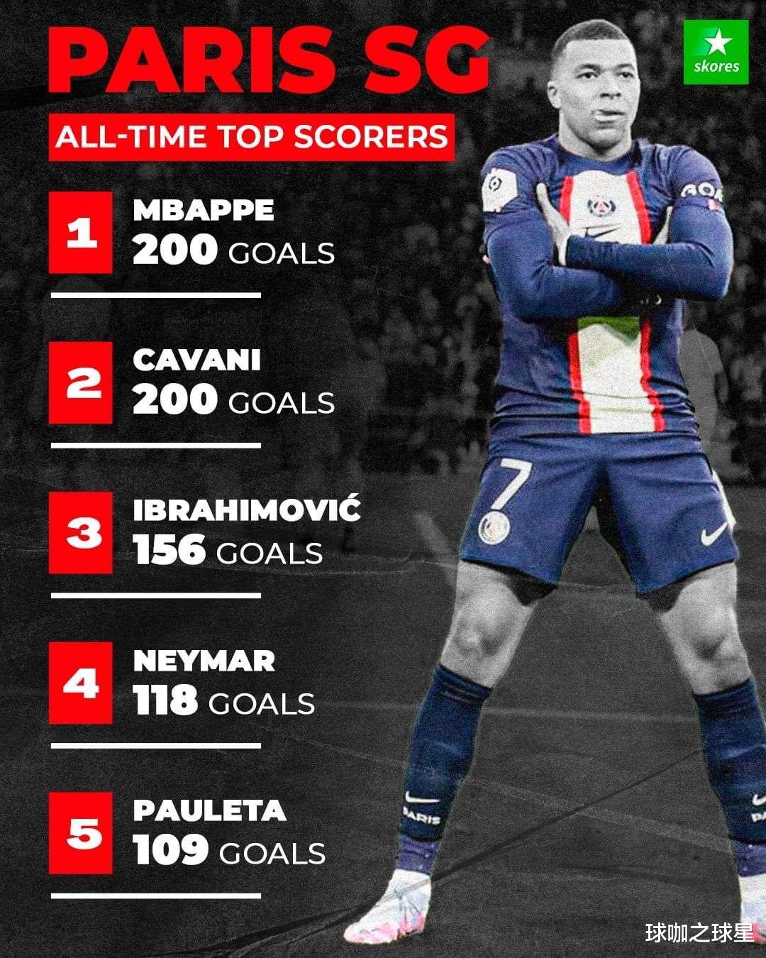 据外媒skores统计:巴黎圣日耳曼队史射手榜前五