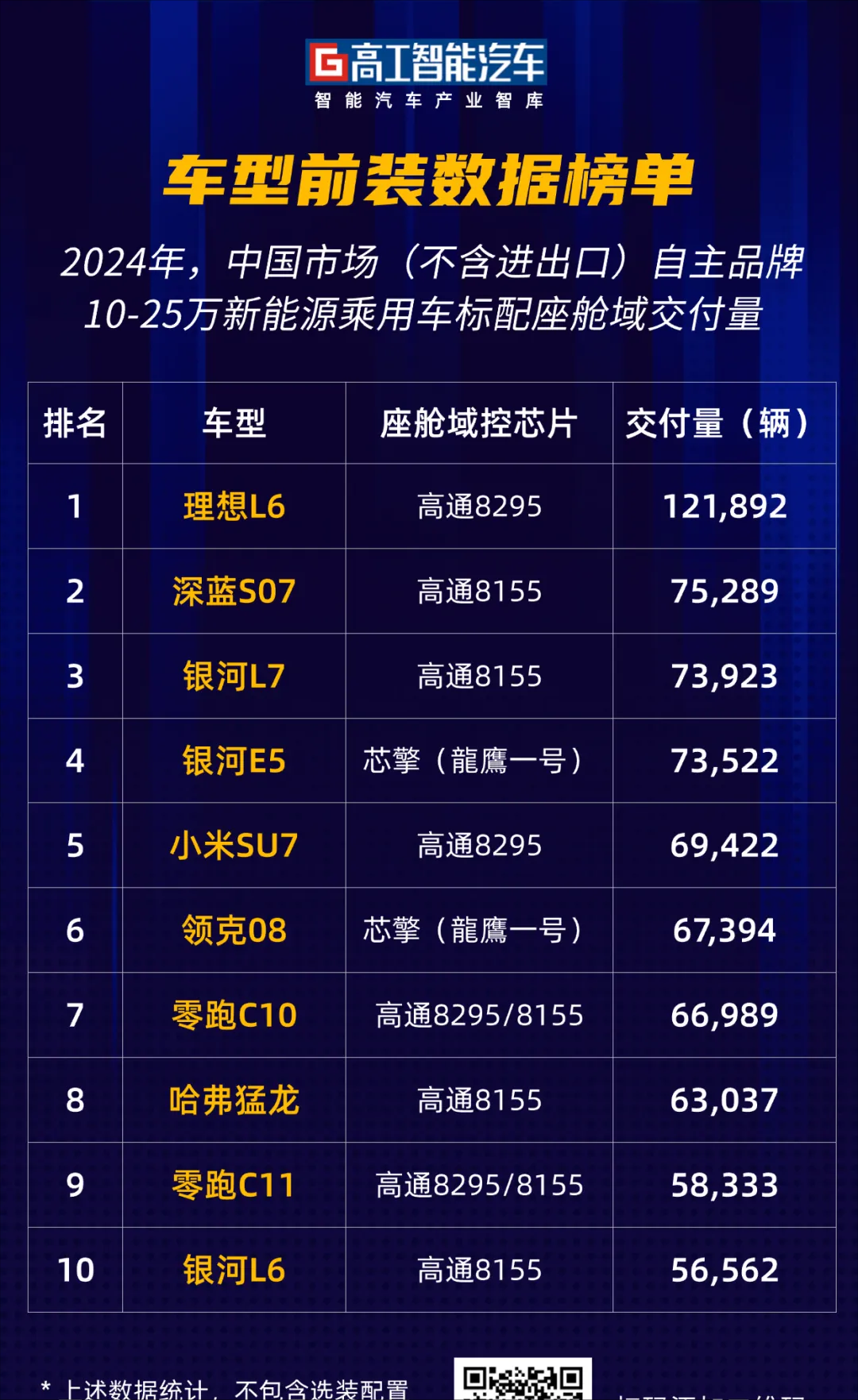 具体来看,2024年中国市场10-25万元价位新能源乘用车座舱域控搭载量TOP10车型,分别有理想L6、深蓝S07增程版、银河L7、银河E5、小米SU7、领克08新能源等,芯擎科技的“龍鷹一号”凭借两款热销车型成为了进入TOP10榜单唯一一款中国本土计算方案。