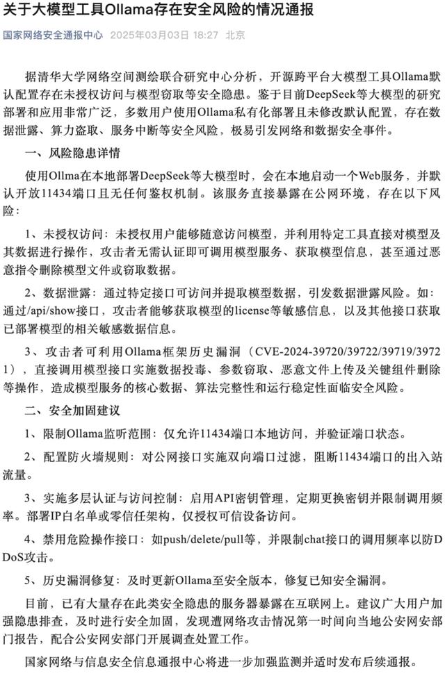同时,需要注意的是,2025年3月3日,国家网络安全中心通报,开源大模型部署工具Ollama存在未授权访问和模型窃取等多项安全隐患。