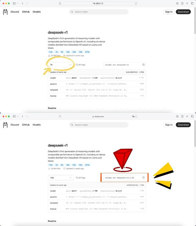 第七步:进入后,可根据自身电脑配置及需求,选择想要下载的模型版本。根据所选模型版本复制红色方框中的代码。