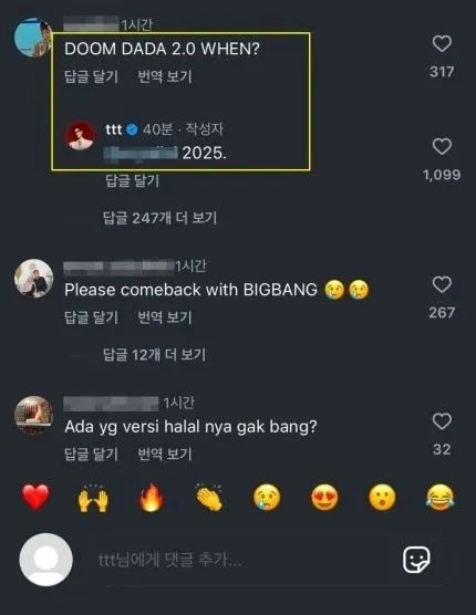 崔胜铉复出?权志龙、姜大声跟太阳在MAMA典礼上合体回归表演,引来BIGBANG粉丝们狂欢。最近,另一位成员T.O.P崔胜铉在被粉丝问到“DOOM DADA 2.0 WHEN”时,他提到了“2025”。