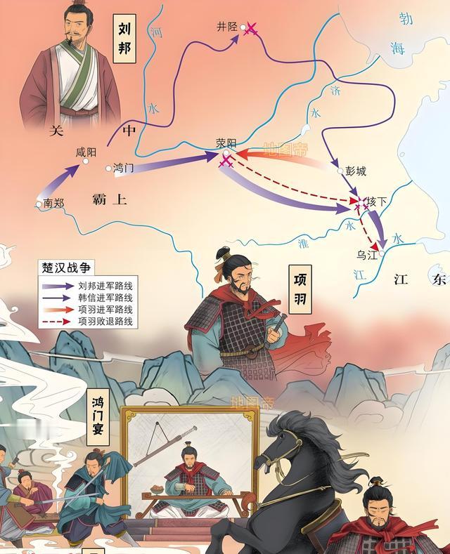 当时,项羽、刘邦两军相距四十里,刘邦决定抄近路回营。他不敢再坐车,只骑了一匹马,樊哙、夏侯婴、靳强、纪信四人握剑持盾随之步行。