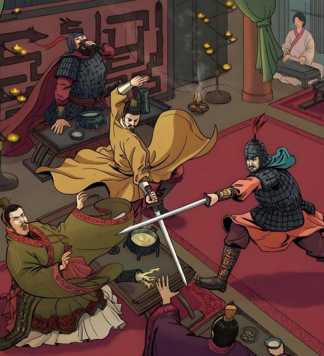 范增起身,到外面把项羽的叔伯兄弟项庄叫过来,对他耳语道:“如今我们的心腹大患刘邦送上门来,这是天赐良机,我们应借机杀掉他。可项王为人太厚道,不忍动手。你要入内居前祝寿,寿毕,为之舞剑,乘隙于坐上杀掉沛公。今日不动手,日后我们都得成为他的阶下囚。”