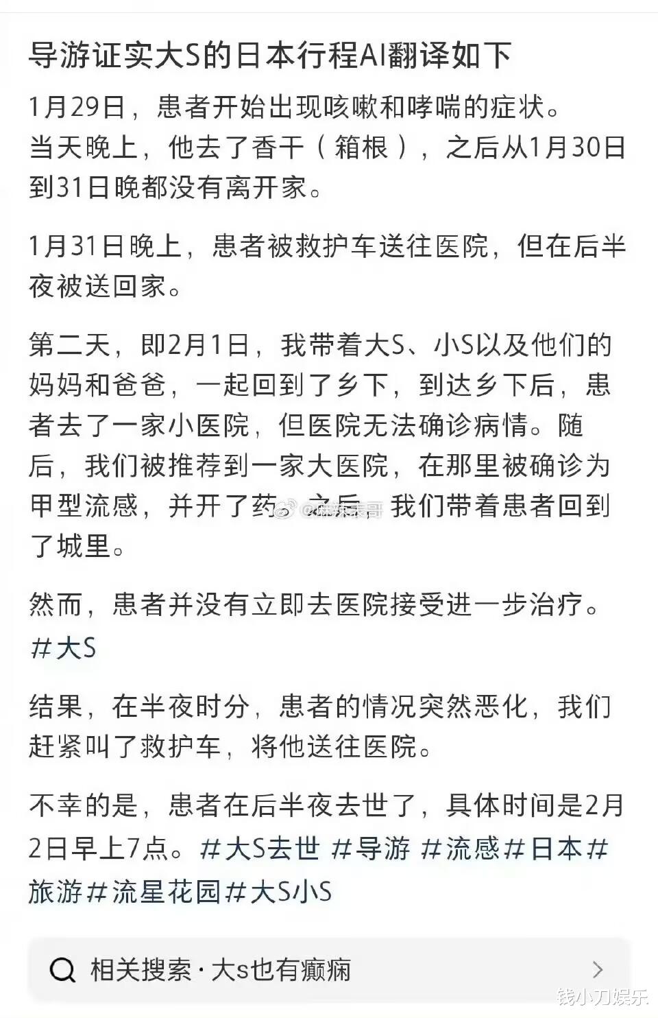 但让人奇怪的是,大S的情况已经这么严重了,到了东京之后,大S的家人仍然没有让她去医院做进一步治疗。