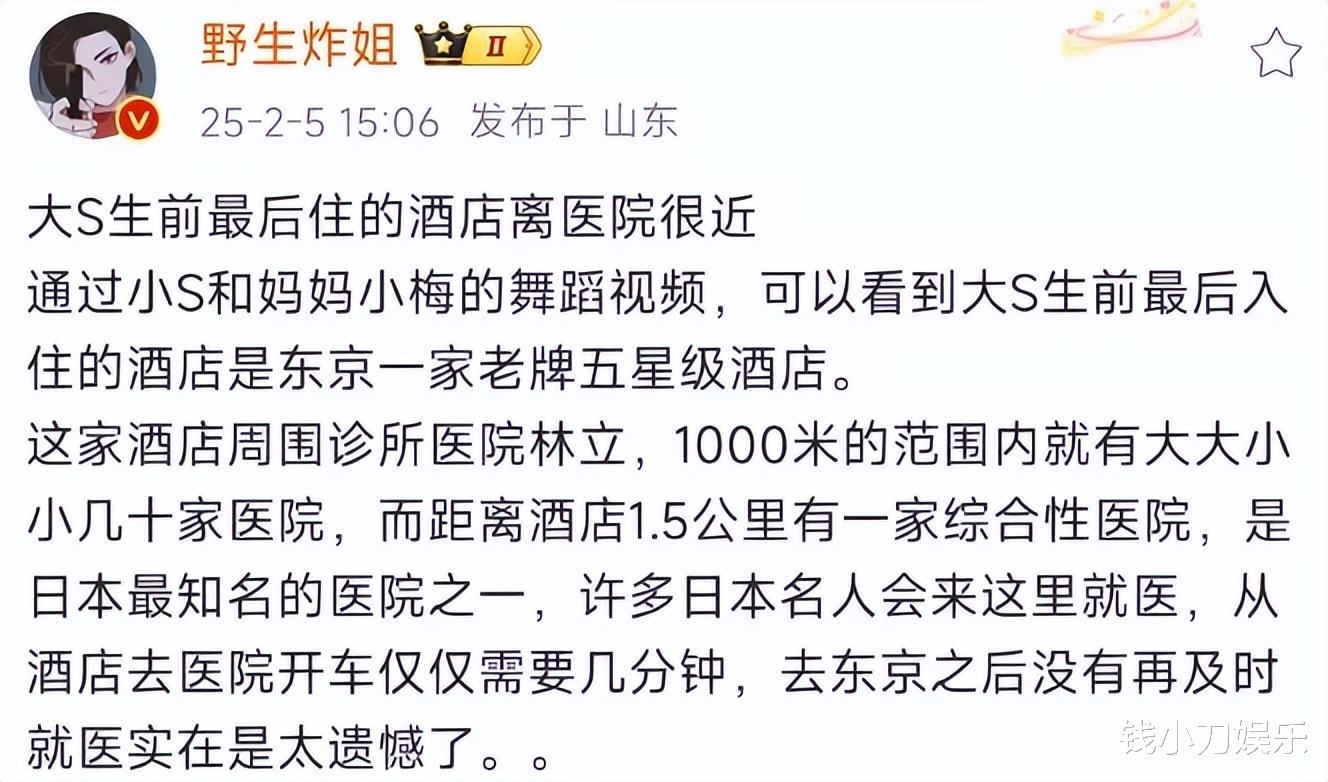 而根据网友的爆料,当时大S她们住的酒店一公里范围内有几十家医院,日本最知名的医院之一距离酒店也只有1.5公里。