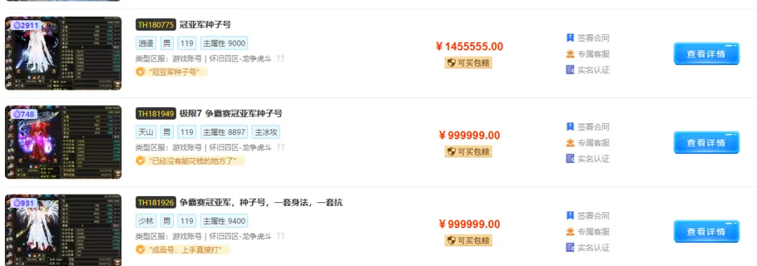 去年争霸赛的亚军队伍已于前日集体上架平台,穷奇号售价高达145万,而毒王和冰王天山两个顶级号,虽然没有穷奇但是也挂出了高达百万的卖价。